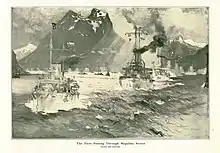 As the Panama Canal was not yet complete, the fleet had to pass through the Straits of Magellan. The scope of such an operation was unprecedented in U.S. history, as ships had to sail from all points of the compass to rendezvous points and proceed according to a carefully orchestrated, well-conceived plan.[1] It involved almost the entire operational capability of the U.S. Navy. During the crossing of the Straits of Magellan, the U.S. ships were escorted by the Chilean Navy cruiser, Chacabuco.[21]