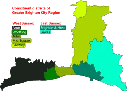 The Greater Brighton City Region is an area in the south of England centred on Brighton, incorporating seven local government districts in East Sussex and West Sussex. The Greater Brighton Economic Board was created in April 2014 to oversee a 6-year programme of development and investment within the area,[1] which as of as of 2021 has about one million people.