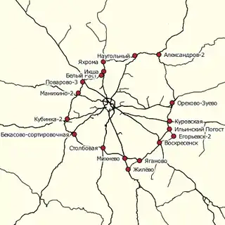 The Greater Ring of the Moscow Railway (Russian: Большое кольцо Московской железной дороги) is the common name for a system of connector lines between the railways that radiate from Moscow. The general configuration of the Greater Ring is a ring around the main part of Moscow (outside Moscow).[1] It forms part of the radial-ring structure of the Moscow railways. The Greater Ring crosses the rail lines in all 11 radial directions from the railway stations of Moscow. It totals 584 kilometres (363 mi) in length. For its entire length, the ring is equipped with an automatic locking system, permitting, where necessary, two-way single-track operation; elsewhere, there are two track and multiple track sections.[2]