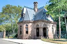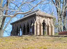 Several wooden shelters were also built, including one in a Gothic Revival style, one resembling an Italian villa, and another resembling a Swiss chalet.[18][19] These shelters, designed by Richard Upjohn, had largely deteriorated by the late 20th century except for a ladies' shelter.[19] In 2008, Green-Wood started to acquire a collection of art pertaining to those buried in the cemetery.[20]