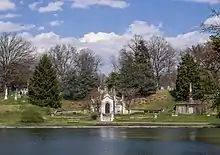 This era was also associated with the construction of other structures. A receiving tomb was installed in 1853, and around the same time, the ponds were cleaned and landscaped.[24] In addition, several gates to the cemetery were added. The main gate at 5th Avenue and 25th Street was built in 1861–65, followed by other entrances near the cemetery's service yard; at 9th Avenue and 20th Street; and at 9th Avenue and 37th Street (later removed).[38] In addition, a gatekeeper's house was installed at the original southern entrance in 1848, the "Thirty Vaults" catacombs in 1854, and a well house in 1855. Furthermore, the paths were paved in the 1860s to allow for easier transport within the cemetery.[23] Several additional ponds were carved out through the 1870s, including Border Water, Dell Water, Crescent Water, Dale Water, and Meadow Water.[56]