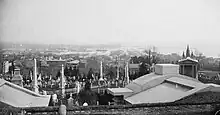 As early as the 1840s, the cemetery had 30,000 visitors per season during the spring and fall; the visitors took horse-drawn carriages or ferries to the cemetery.[57] To accommodate those who came to the cemetery, a ferry service to the cemetery was established in 1846.[38] The burial ground was expanded multiple times. Originally 175 acres were enclosed, stretching between 21st and 37th Streets from 5th to 9th Avenue.[38] The first additional acquisition in 1847 was for 65 acres (26 ha) at the southwest corner of the cemetery, adjacent to the contemporary border of the city of Brooklyn. Another 85 acres (34 ha) to the east was acquired in 1852 through the annexation of land in the then-separate village of Flatbush. Finally, in 1858 another 23 acres (9.3 ha) was acquired at the southeastern corner of the cemetery grounds. A plot at the southeast corner of the cemetery was purchased in 1863, allowing the commissioners to straighten out that border.[23][24]