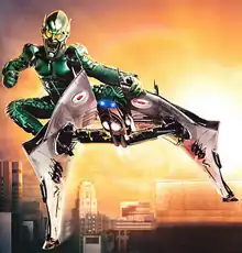 The Norman Osborn incarnation of the Green Goblin appears in Spider-Man: Into the Spider-Verse, voiced by Jorma Taccone. This version takes heavy inspiration from the Ultimate Marvel iteration coupled with visual elements from various other previous incarnations. Additionally, he works as an enforcer for the Kingpin.[19][20] While fighting Spider-Man to protect the Kingpin's Super-Collider, the Goblin shoves the former into it, resulting in an explosion that severely injures Spider-Man and kills the Goblin.