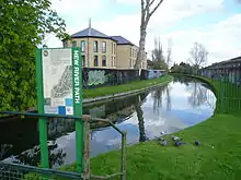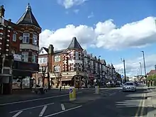 Green Lanes[3] runs from Newington Green north along the western edge of Stoke Newington, thereby forming the border between Hackney and Islington, until it reaches Manor House at the eastern edge of Finsbury Park. As it crosses the New River over Green Lanes Bridge, it enters the London Borough of Haringey, it then runs 1.4 miles (2.3 km)[4] through the neighbourhood of Harringay. From the junction with Turnpike Lane the road temporarily changes its name and runs for 1.3 miles (2.1 km)[5] through Wood Green as 'High Road', resuming its Green Lanes identity again after the junction with Lascotts Road. It then continues north for another 2.2 miles (3.5 km)[6] through Palmers Green and Winchmore Hill in the London Borough of Enfield, until it reaches the junction with Ridge Avenue and Green Dragon Lane at Mason's Corner. The northward continuation into Bush Hill at this point is now blocked.