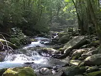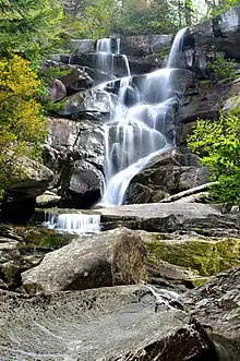 Greenbrier is underlain by a Precambrian metamorphic rock formation of the Ocoee Supergroup known as Roaring Fork Sandstone.[1] This rock type, created from ancient ocean sediments 750 million years ago, dominates the mid-level elevations in the north-central Smokies. As the elevation increases to the south, a thrust fault known as the Greenbrier Fault separates the Roaring Fork sandstone from Thunderhead sandstone and Anakeesta Formation, both of which are common along the Smokies crests. To the north, as the land flattens out (near the park boundary), another thrust fault, the Gatlinburg Fault, separates the Roaring Fork formation from a layer of siltstone, which underlies the foothills around Emert's Cove.[2]