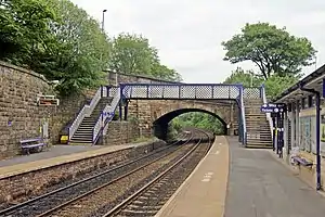 Planning permission for the refurbishment of Greenfield railway station was granted in early 2008. This was to provide a new ticket office, refurbished waiting areas, toilets, and possibly a small shop, and was due to be completed in the Winter of 2008. After some problems with planning regulations and the original building contractor going into administration,[6] the new facilities were finally completed in Spring 2009. The ticket office is staffed on a part-time basis (Mondays to Saturdays, morning to early afternoon only) and there is also a ticket vending machine available. Step-free access is limited to the Manchester-bound platform only, as the Huddersfield-bound one can only be reached by footbridge.[7]