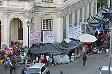 The Greenmarket Square refugee sit-in was a sit-in protest by a group of refugees for the purpose of getting relocated to a country outside of South Africa in response to xenophobia in the country. It lasted from 8 October 2019 when protestors first occupied the Waldorf Arcade to 2 April 2020 when the last group of protestors were evicted from the Central Methodist Mission church.[4] The protestors demanded that UNHCR assist them with being relocated to a third country outside of South Africa and other than their country of origin.[5][6] At its height the protest grew to include about 624 protestors, including 65 undocumented refugees, according to a lawyer for the South African Department of Home Affairs.[7]