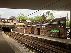 The railway cutting includes an area to the northeast of the station. A branch line diverged from the westbound track after the Duncan Street bridge and, passing to the north of columns supporting the Bruce Street bridge, curved round into a goods yard with sidings extending to West Shaw Street. A track continued into Walker's refinery.[20][21]