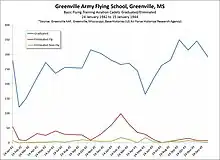 From January 1942 until January 1944, 5,705 Aviation Cadets graduated from the Basic Flying School at Greenville Army Airfield, while 605 were eliminated for flying deficiencies and another 113 for non-flying deficiencies.