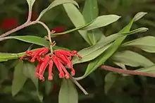 Grevillea epicroca is a shrub that typically grows up to 1–2.5 m (3 ft 3 in – 8 ft 2 in) high and has branchlets with a few silky hairs. Its leaves are elliptic to lance-shaped, mostly 40–70 mm (1.6–2.8 in) long and 8–12 mm (0.31–0.47 in) wide, the lower surface with a few silky hairs pressed against the surface. The flowers are arranged in small groups near the ends of branchets on a rachis 10–25 mm (0.39–0.98 in) long. The flowers are red and silky-hairy, the style red or pinkish and more or less glabrous, and the pistil 16–20 mm (0.63–0.79 in) long. Flowering mainly occurs from November to May and the fruit is a follicle 18–24 mm (0.71–0.94 in) long.[3][4][5]