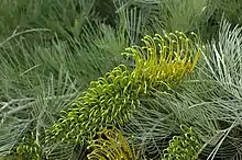 Grevillea formosa is a sprawling shrub that typically grows to a height of up to 1 m (3 ft 3 in), with trailing branches up to 2 m (6 ft 7 in) long. Its leaves are divided, 60–180 mm (2.4–7.1 in) long with 5 to 26 erect, linear leaflets, sometimes further divided, the end lobes 30–90 mm (1.2–3.5 in) long and 0.5–1.0 mm (0.020–0.039 in) wide. The edges of the leaflets are rolled under, but are not sharply-pointed. The flowers are arranged in toothbrush-like clusters along a rachis 120–300 mm (4.7–11.8 in) long. The flowers are green, turning bright golden-yellow as they age, the pistil 54–60 mm (2.1–2.4 in) long. Flowering occurs from January to March and the fruit is a shaggy-hairy follicle 11–16 mm (0.43–0.63 in) long.[3][4]