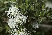 - Grevillea humilis subsp. maritima Makinson[11] has narrowly oblong to narrowly egg-shaped leaves with the narrower end towards the base, 2.5–6 mm (0.098–0.236 in) wide, the upper surface silky-hairy, each flower on a pedicel 5–9 mm (0.20–0.35 in) long, the flowers usually white, flowering from March to September.[12][13]