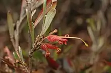 Grevillea oligantha is a shrub that typically grows to a height of 0.5–2.5 m (1 ft 8 in – 8 ft 2 in) and has many erect branches. Its leaves are egg-shaped or lance-shaped with the narrower end towards the base, or linear, 12–80 mm (0.47–3.15 in) long and 1–8 mm (0.039–0.315 in) wide. The edges of the leaves are curved downwards and the lower surface is silky-hairy. The flowers are arranged singly or in groups of up to 6 in leaf axils or on the ends of short side branches on a rachis 0.4–2.5 mm (0.016–0.098 in) long, and are brownish-yellow, orange or reddish-brown, the pistil 18–22.5 mm (0.71–0.89 in) long and the style pale yellow to reddish with a green tip. Flowering mainly occurs from May to November, and the fruit is a glabrous oval to elliptic follicle 10.5–12.5 mm (0.41–0.49 in) long.[2][3]
