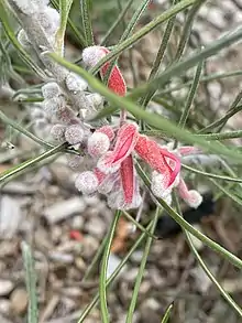 Grevillea pityophylla is a shrub that typically grows to a height of 0.5–1.5 m (1 ft 8 in – 4 ft 11 in) and has many branches. Its leaves are linear to more or less cylindrical, 40–150 mm (1.6–5.9 in) long and 0.9–1.8 mm (0.035–0.071 in) wide. The upper edges of the leaves are rolled under to the mid-vein with two longitudinal grooves either side. The flowers are arranged in groups of up to 3 to 6 in leaf axils, on a shaggy-hairy rachis about 0.5 mm (0.020 in) long and are pinkish-red to bright red and shaggy-hairy, the pistil 18–23 mm (0.71–0.91 in) long. Flowering occurs from July to October and the fruit is an oval to elliptic follicle 11–13.5 mm (0.43–0.53 in) long.[2][3]