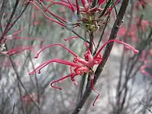 - Grevillea sarissa S.Moore subsp. sarissa[16] has red and cream-coloured flowers with a red, pale green-tipped style, from September to December.[4][17][18]
