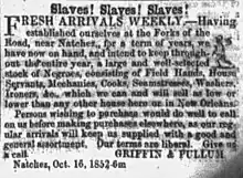 Griffin & Pullum was part of the chain of slave traders who kidnapped and trafficked Henrietta Wood to Mississippi.[4] Later in the 1850s, Griffin & Pullum became Griffin, Pullum & Co., with Asa Blackwell and F. G. Murphy representing the Co.[5] Also in 1860 Griffin & Pullum advertised that they were selling out of the "old Elam House" at Forks of the Road slave market, meaning the former premises of R. H. Elam.[6][3] According to historian Steven Deyle, "...newspaper editors in the Lower South helped to promote the [internal slave] trade by occasionally running news stories praising the services of local traders or announcing upcoming sales...In Natchez, the Mississippi Free Trader informed its readers that the firm of Griffin & Pullum had a new lot of slaves for sale, adding that 'this is an old established firm known far and near for the probity that has always marked their every transaction.'"[7]