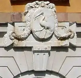 On 29 June 1571, Andreas Grill, burgher in Augsburg received burgher arms in letters patent from a count palatine of the Holy Roman Empire.[5] The name Grill comes from the Italian Grillo, meaning cricket, while the family's coat of arms displays a crane holding a cricket in its bill.[lower-alpha 2]