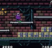 Grimace's Birthday is a side-scrolling platformer in which players take control of Grimace over four levels in two stages. In with the first stage, the player controls Grimace on a skateboard, and can perform rail grinds and tricks. In the second stage, Grimace moves freely and possesses a bubble power-up allowing the player to float. Each level is scored against a time limit, with points accumulated from actions such as defeating enemies and performing tricks. Throughout the levels, players can collect 40 Grimace Shakes for additional points. After completing the stages, the player can complete a bonus minigame and blow out the candles of their birthday cake for bonus points.[1] Grimace's Birthday features two game modes besides the main story mode: a "Score Attack" mode in which players are required to gain as many points as possible under a time limit and a "Freeskate" mode in which players can move freely with no time limit.[2]