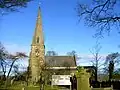 The Parish Church is a typical village church with a tower topped with an elegant spire which makes a conspicuous landmark from across the Manifold Valley. From this it received the nickname "the Cathedral of the Moorlands". The present building was built in 1848. The first church in Grindon was built in the 11th century as a chapel of ease for the Parish of St Bartram, Ilam.[1] One of the rectors of Grindon parish was Anthony Draycot who served from 1540 to his imprisonment in 1560. Draycott was the judge at the heresy trial of Joan Waste.[2]