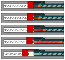 In Horn's gun, one end of the piston is connected to the bolt by a joint and the other end is connected to the receiver by a small spring. The piston also exhibits an interesting sideways motion. As the bolt moves further backward, the piston moved slightly sideways as well, allowing most of the gas to escape without exercising further pressure. The role of the small spring was to ensure the return of the piston's head into position on the counter-recoil.[1]