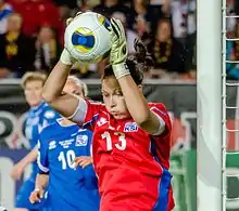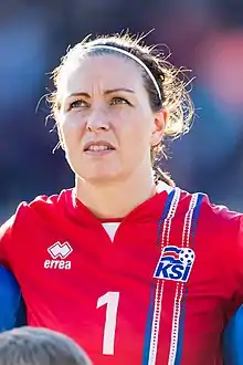 National team coach Siggi Eyjólfsson selected Guðbjörg in the Iceland squad for UEFA Women's Euro 2013,[10] while rival goalkeeper Þóra Björg Helgadóttir was recovering from a hamstring injury.[11] Guðbjörg took the goalkeeping position at the final tournament, playing in all three group matches and the 4–0 quarter-final defeat to hosts Sweden. The Swedish press hailed her as one of the best players at the competition.[12]
