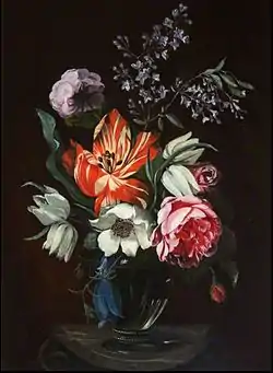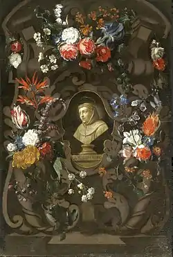 Gysaerts collaborated with other painters particularly in the production of garland paintings. Garland paintings are a special type of still life developed in Antwerp by artists such as Jan Brueghel the Elder, Hendrick van Balen, Frans Francken the Younger, Peter Paul Rubens and Daniel Seghers. They typically show a flower garland around a devotional image or portrait. Garland paintings were usually collaborations between a still life and a figure painter.[3] In 1676 Gualterus Gysaerts collaborated with his uncle David Teniers the Younger on a series of 19 garland paintings depicting the martyrs of Gorkum. The series was made for the Minorite Church in Mechelen following the beatification of the martyrs on 9 July 1676. Teniers painted the monochrome bust portrait of each martyr in a cartouche while Gysaerts painted the cartouche and the flower garland surrounding it. Of these paintings, 8 are still known to exist, one of which is in the Rijksmuseum. Both Gysaerts and Teniers signed the painting in the Rijksmuseum.[2]