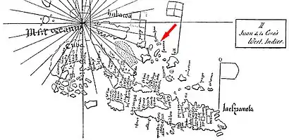 Columbus's descriptions of Island IV are, at best, confusing. He describes Island IV being "on an east-west course" from Island III (which contradicts his previous description of the fleet's movements in the search), and he also asserts that from the northern point the coast ran west for 12 leagues, to its western cape, Cabo Hermoso.[21] The direction of this coastline running west contradicts both Columbus's own arrival at the island (since he arrived at the north point by sailing east, and did not arrive at Cabo Hermoso first) and his later description of his departure from this northern end of Island IV (as he departed sailing SSW and yet did not run aground).