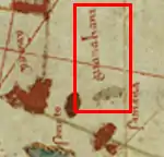 Guanahani ("San Salvador"), found by Columbus in 1492. Label and islets marked within the red box.