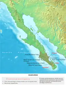 The Guaycura were initially resistant to the missionary endeavors of the Jesuits. In 1716, the first attempt, led by Jesuit Juan María de Salvatierra, to establish a mission and a Spanish settlement among the Guaycura at La Paz resulted in the death of several Guaycura women at the hands of Indian followers of the Jesuits. The first Jesuit mission among the Guaycura was at La Paz and it was intended to serve not only as a missionary center, but as a rest and resupply stop for the Manila galleons returning from the Philippines. However, La Paz was a fractious area, contested by several Guaycura bands and the Pericú of southernmost Baja California. The mission, during its 30 years of existence "would serve more as a base for the unintentional destruction of the region's peoples than as a center for their evangelization."[12] The long-running opposition to the Jesuit missions and presence terminated in the Pericúe revolt of 1734, in which several Jesuits and their followers and Spanish sailors were killed by the Pericú and Guaycura, especially the Uchití band. Meanwhile the Guaycura were being devastated by introduced European diseases such as measles and smallpox. In 1748, after many years of frustration, the Jesuits decided to concentrate the southern bands of the Guaycura into a single settlement at Misión Todos Santos. There, the Jesuits forcibly detained the Guaycura children at the mission and their parents and relatives "for love of the children remained pacified."[13]