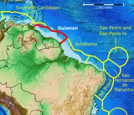 The Guianan marine ecoregion stretches along the middle of the northeast coast of South America, touching Venezuela, Guyana, Suriname and French Guiana. It extends about 200 miles offshore, with the warm Guianan Current moving east-to-west through the region. This current brings in fresh, turbid waters from the mouth of the Amazon River to the east. As the current exits the ecoregion to the west it contributes an estimated 70% of the waters of the Caribbean Sea.[2] A very large oil field has been recently discovered in the Guyana-Suriname Basin of the ecoregion.[3][4] The Guianan is one of two ecoregions (the other being the Amazonia marine ecoregion) in the North Brazil Shelf province,[5] a Large marine ecosystem (LME). The Guianan is thus part of the larger Tropical Atlantic realm. [6] [7] [8]