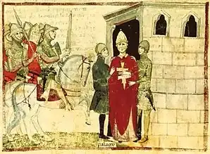 Guillaume de Nogaret and Sciarra Colonna capture Pope Boniface VIII. (Depiction from the Nuova Cronica by Giovanni Villani , 14th century)