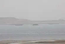 The Gulf of Salwah is an elongated bay extending southwards from the Gulf of Bahrain. It is about 80 km (50 mi) long and about 20 km (12 mi) wide at its widest point. To the west lies Saudi Arabia and to the east Qatar.[1] The surface of the land surrounding the Gulf of Salwah is largely flat, covered with sand or pebbles. On the east side, there are sand dunes and salt flats at the southern end and low cliffs and hills further north on the west coast of Qatar, and this is the area where the main oilfields are located.[2] On the west side of the Gulf the coast is sandy with high groundwater levels supporting extensive reed beds. There are shallow hypersaline lagoons, and low islands have appeared along the shore caused by changes of water level. The gulf itself is shallow with a base of sand and rock and meadows of seagrass.[3]