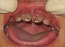 | Brown discoloration of the teeth caused by porphyrin accumulation which will fluoresce under Wood's lamp (Erythrodontia). | |