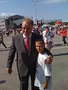 Guntis Ulmanis has been married to Aina Ulmane (maiden name Štelce) since 1962.[7] They have two children: Guntra (b. 1963) and Alvils (b. 1966) and three grandchildren. In his spare time, Ulmanis enjoys reading history books and memoirs, playing tennis, basketball and volleyball. He is known to also spend summers in his home in Smārde Parish.[8]