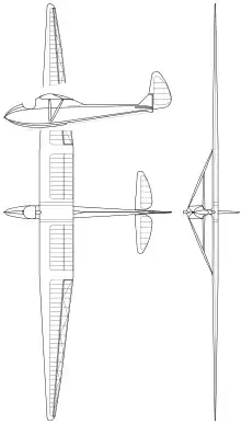 It was an all wood monoplane with a two-part wing built around a forward main spar and a rear false spar. The inner area of each part was rectangular in plan, tapering strongly outboard. The leading edges ahead of the main spar were plywood-covered, as was the whole wing at the inner-outer junction; the rest was fabric-covered. An aileron filled the whole trailing edge of each outer section. The two parts joined at a narrow centre-section on a raised fuselage pylon and were braced on each side with a V-strut from the fuselage bottom to the wing spars at the inner-outer junctions.[1]