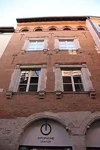For a long time attributed solely to Guillaume de Saint-Germain, the house was in truth partially built by the burgher Jean Astorg. The latter belonged to the financial elite who were regularly sought out by the capitouls in period of crisis (war efforts). For the decoration of his new building at the back of the courtyard he decided to imitate the windows of his neighbour Pierre Delpech. Such imitation was prevalent throughout the century, and amounted to honorific appropriation. These windows possess impressive frames, known as chambranle à crossettes, supported by four short pilasters. The latter, adhering to the principles of manneristic aesthetic founded on surprise, do not play a structural role but instead appear to be suspended and dependant on the frame they should, by rights, be supporting.[1]