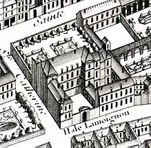 Diane de France, legitimised daughter of Henry II of France and his young mistress Filippa Duci, was created Duchess of Angoulême in 1582. Her new title brought with it considerable wealth, and, when in 1584 she inherited a large lot near the intersection of the rue des Francs-Bourgeois and the rue Pavée in the Marais district, she decided to use it as the location of her main urban residence.[2][3] Construction of the Hôtel d'Angoulême began in 1584, but was likely interrupted by the Wars of Religion, and only completed by a second phase of construction in 1611.[3] Its architect is still uncertain: long attributed to Baptiste Androuet du Cerceau on stylistic grounds, an archival discovery of 1984 led some historians to name Louis Métezeau as the architect.[4] It is now suggested that Louis' father, Thibault Métezeau, more likely designed it.[5][6] Another hypothesis suggests Philibert Delorme built the hôtel a little earlier in the century.[7]