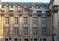 Following the death of Diane in 1619, Charles de Valois, illegitimate son of Charles IX and nephew of Henri III, inherited the building and lived in it until 1650. He commissioned architects François Boullet and Jean Thiriot to enlarge the hôtel, altering the original plan, between 1624 and 1640.[5] A new wing north of the entrance courtyard was added, facing the rue des Francs-Bourgeois; a small watchtower cabinet, corbelled into the street corner wall, allowed the fidgety Charles d'Angoulème to spy on both streets.[5] A bellicose commander during the troubled era of the Wars of Religion, Charles kept in the building a large number of weapons, carabins, muskets, using it as a military structure.[2]
