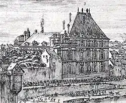 The corps de logis was laid out perpendicular to the river with its entrance to the west and a garden to the east. Because of problems acquiring land to the south (where the city wall of Philippe Auguste still stood), only the north terminal pavilion, the central pavilion and the wing connecting them were constructed. This is evident in a 1648 (or earlier) drawing by Israel Silvestre with a view from the west[10] and a 1637 painting by Abraham de Verwer.[11] Near the beginning of the 17th century, Claude Chastillon drew a view from the east, projecting how the completed hôtel would have looked.[12]