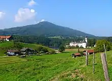 The monastery with its rococo church on a peninsula in Lake Höglwörth represents one of the finest ensembles in the eastern Upper Bavaria. The church was rebuilt from 1675. The choir was preserved from the Romanesque church.[2] Before silting to the east the monastery was on an island, but it is now on a peninsula.[3] Wörth is an old word for island, and it is still shown as an island on the field map from the 19th century.[4]