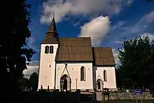 A first stone church was built in Romanesque style here during the 12th century. The oldest part of presently visible church however, is the tower dating from the first half of the 13th century. The rest of the Romanesque church was eventually pulled down and replaced with a Gothic main building. Thus the choir and the vestry are from the end of the 13th century, while the nave was built during the early 14th century. When the nave was constructed, the choir was also modestly "modernised" by the insertion of the presently visible eastern window. Original plans probably intended to eventually also replace the comparatively small tower with a more proportional, Gothic church tower.[2]