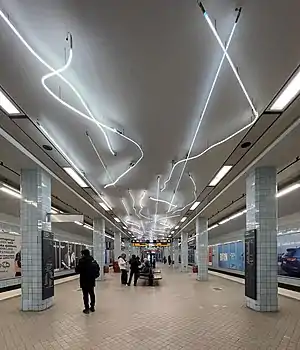 The station's original 1950s signage and decor have been deliberately retained. As part of Art in the Stockholm metro project, 103 white neon strips have been installed in the platform ceiling. These were executed by Gun Gordillo and date from 1998.[4][5]