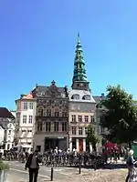 The large property at No. 4 on the other side of the square, at the corner of Læderstræde, is from 1796-1797 and was originally built as a new headquarters for Johan Frederik Schultz's printing business. It has 9 on the square and 20 bays on Læderstræde. The corner bay is topped by a small spire which was added in about 1900.[4] The building housed the Ministry of Environment from 1993 to 2014. It has now been converted into apartments and contains a Moss Copenhagen flagship store in the ground floor.[5] The five-bay house at No. 6 was built in 1804-06 by Niels Schønberg Kurtzhals for silk and textile merchant Lorentz Andreas Hinrichsen. The four-bay house at No. 8 was built for another silk and textile merchant, Nikolaj Abraham Kall. The building at the corner of Gammel Strand (No. 10) is the former headquarters of the insurance company Kgl. Brand. The building was originally designed by Fritz Koch but completed after his death by Gotfred Tvedein 1906æ It now houses the law firm Johan Schlüter .