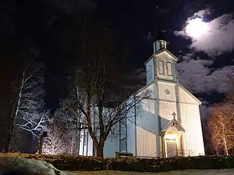 Hølonda Church (Norwegian: Hølonda kirke) is a parish church of the Church of Norway in Melhus municipality in Trøndelag county, Norway. It is located near the Krokstad farm, just west of Gåsbakken which is about 14 kilometres (8.7 mi) west of the village of Hovin and about 9 kilometres (5.6 mi) southwest of the village of Korsvegen. It is the church for the Hølanda parish which is part of the Gauldal prosti (deanery) in the Diocese of Nidaros. The white, wooden church was built in a cruciform style in 1848 using plans drawn up by the architect Christian Heinrich Grosch. The church seats about 250 people.[1][2][3]
