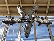 Public art is present at the station via the Station Art Program. A metalized fiberglass sculpture hangs above the entrance, titled He Kauhulu ʻAnae (A Gathering of Mullets) by artist Donald Lipski. It depicts mullets from the historical loko iʻa (fishponds) in the region, inspired by the legend of Miahea, who asked the gods Kāne and Kanaloa for prosperity; in response, standing at Hāʻupu (now known as LCC), they gave a chant: "May the fish ponds down at Waiawa be as the stars in the sky above."