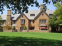 The H.H. Champlin House is a two-and-one half-story sandstone building designed in the Tudor Revival style. The house, completed in 1939, is located at 612 S. Tyler in Enid, Oklahoma. It is located within the Kisner Heights addition to the city of Enid, developed from farmland formerly owned by R.H. Kisner. Architects Roy Shaw and Norris Wheeler designed the house.[2] The D.C. Bass Company constructed the main house with walls of Briar Hill sandstone and Vermont slate roofing and terrace. A variety of windows were custom made for the house by Kawneer Company of Niles, Michigan. Jacoby Art Glass Company of St. Louis, Missouri, created art glass insets for the Tudor arch windows, featuring scenes from Oklahoma history. The property also includes a carport and greenhouse.[3] The property is currently owned by Enid businessman and attorney James Sears Bryant.[4]