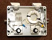 The HB9XBG antenna is based on the use of a speaker audio cable with a strand cross-section of 2 × 2.5 mm2 and PVC insulation. A speaker cable of this kind has an impedance of almost exactly 100 Ω and performs two functions at the same time: the function of the feedline as far as the centre of the dipole and the function of the "radiating common mode current" for the lower dipole leg. One core of the two-core cable is removed on the upper half of the dipole. A resonant trap L2/C2 eliminates the common mode current at the lower end of the antenna.[2] The L1/C1 components (see the illustration) matches the feedline impedance of 50 Ω to the 100 Ω system of the antenna.