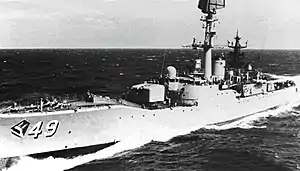 HMAS Derwent (F22/DE 22/DE 49), named for the Derwent River, was a River-class destroyer escort of the Royal Australian Navy (RAN). She was laid down by Williamstown Naval Dockyard in 1959, and commissioned into the RAN in 1964. During the ship's career, she was deployed to South East Asia on 23 occasions, including operations during the Indonesia-Malaysia Confrontation, and escort of the troopship HMAS Sydney to and from the Vietnam War. Multiple flag-showing cruises were also embarked upon, with port visits throughout Asia, the Indian Ocean, and the Pacific Ocean. Derwent was also briefly used to portray a fictional vessel for the British drama series Warship.