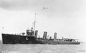 On 25 February 1917, Lawford was one of ten destroyers waiting on stand-by at Dover when German torpedo boats launched another raid on the Dover Barrage and shipping in the Channel. The raid was ineffective, with a clash between the patrolling destroyer Laverock causing one group of German torpedo boats to turn back, while a second group of German torpedo boats shelled Margate and Westgate-on-Sea, destroying a house and killing a woman and two children. The stand-by destroyers were ordered to form a patrol line in the channel in response, but saw nothing.[47][48] In March 1917, the 9th Destroyer Flotilla was split up, with the newer destroyers joining the 10th Destroyer Flotilla, and the L-class ships being dispersed to different units, with Lawford joining the 7th Destroyer Flotilla operating on the East coast of Britain.[49][50][51] Lawford was modified to carry modern H-type mines in 1917,[2] and by August 1917 was listed as one of four[lower-alpha 3] minelaying destroyers in the 7th Flotilla.[52]