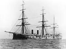 Originally designed with three masts, Northumberland was fitted with five masts until her 1875–79 refit when two were removed and she was re-rigged as a barque.[7] Northumberland only made 7 knots (13 km/h; 8.1 mph) under sail,[8] mainly because the ship's propeller could only be disconnected and not hoisted up into the stern of the ship to reduce drag, the worst speed of any ironclad of her era.[9] Admiral George A. Ballard described the Minotaur-class ships as "the dullest performers under canvas of the whole masted fleet of their day, and no ships ever carried so much dress to so little purpose."[10]